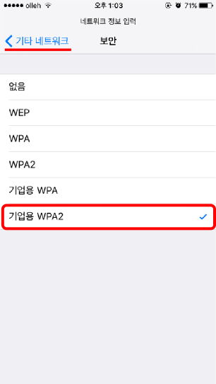 4. 보안은 <그림4> 기업용WPA2 선택 후